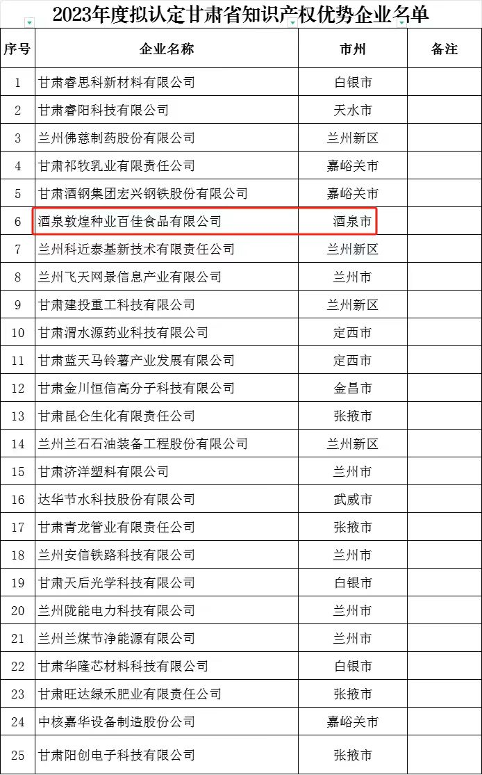 喜訊傳來!酒泉敦煌種業(yè)百佳食品有限公司榮獲“甘肅省知識產權優(yōu)勢企業(yè)”稱號